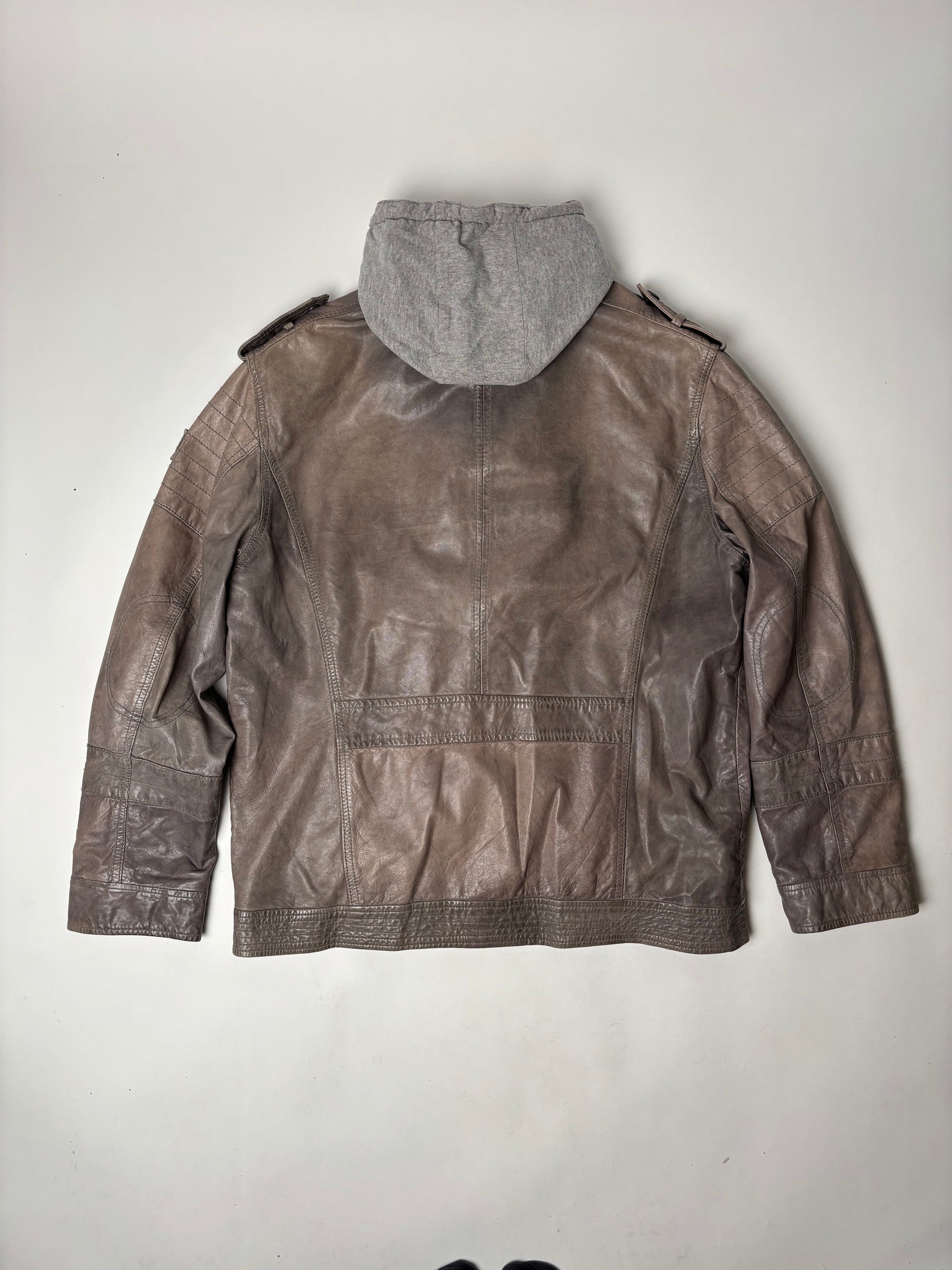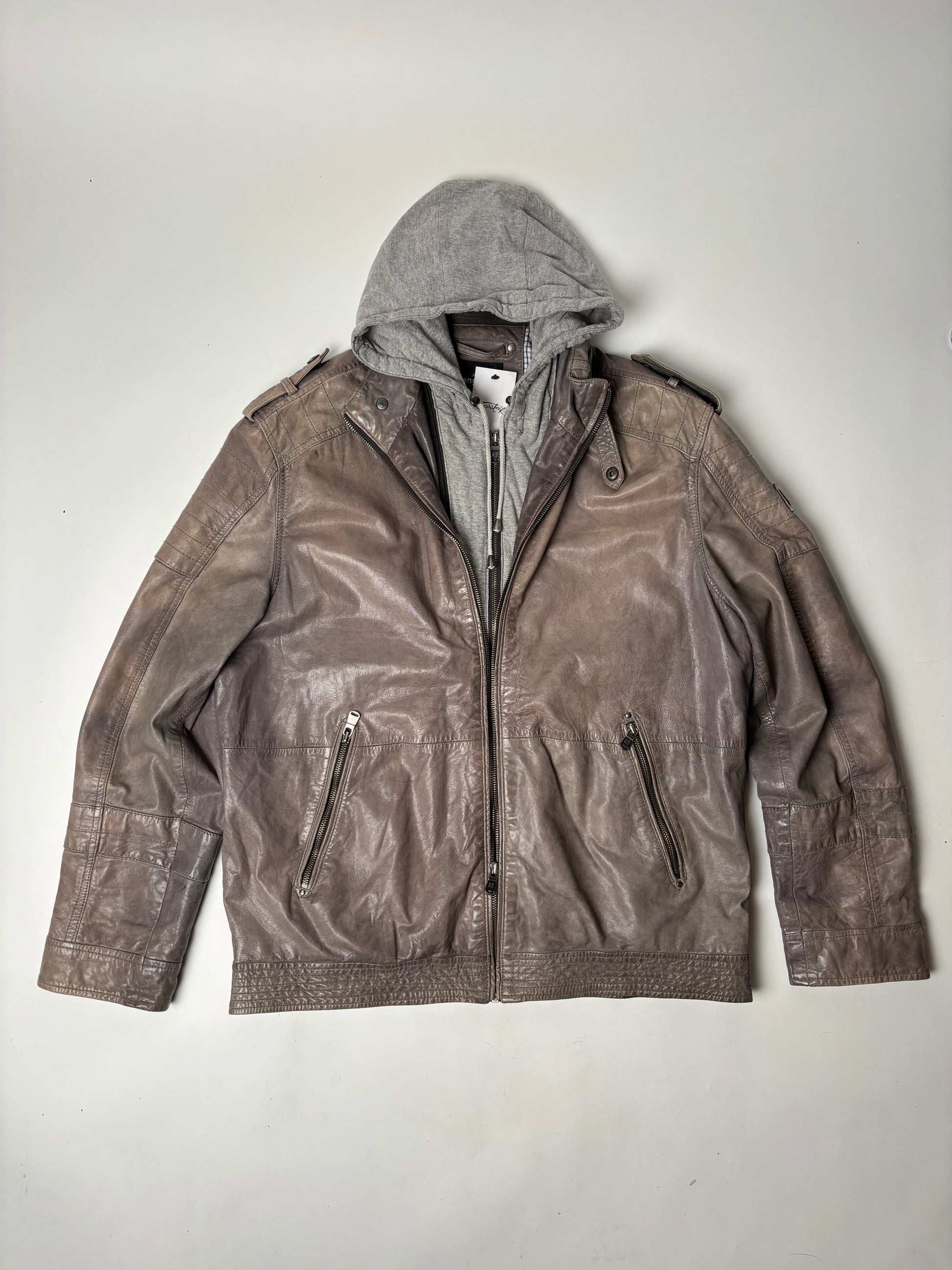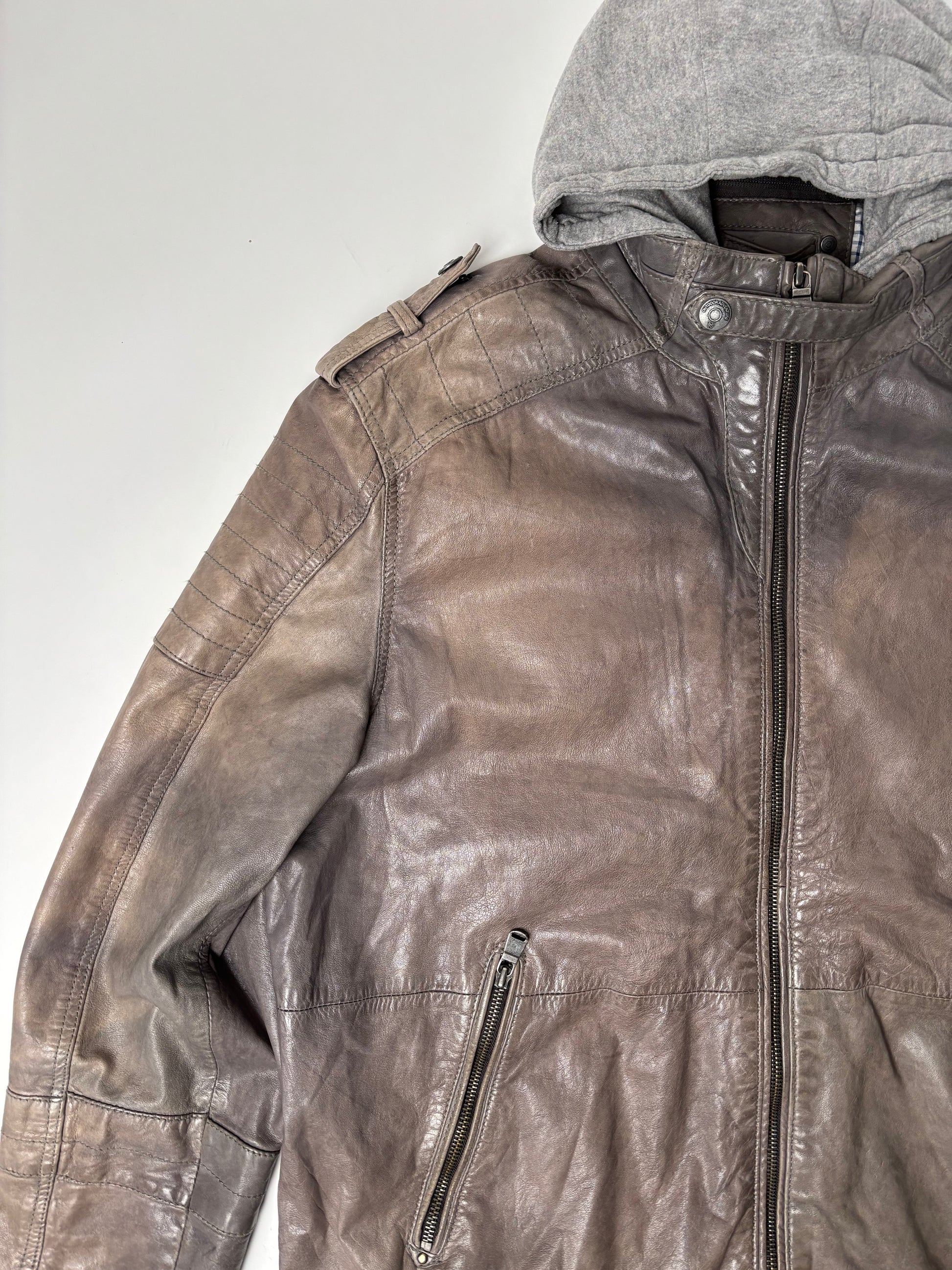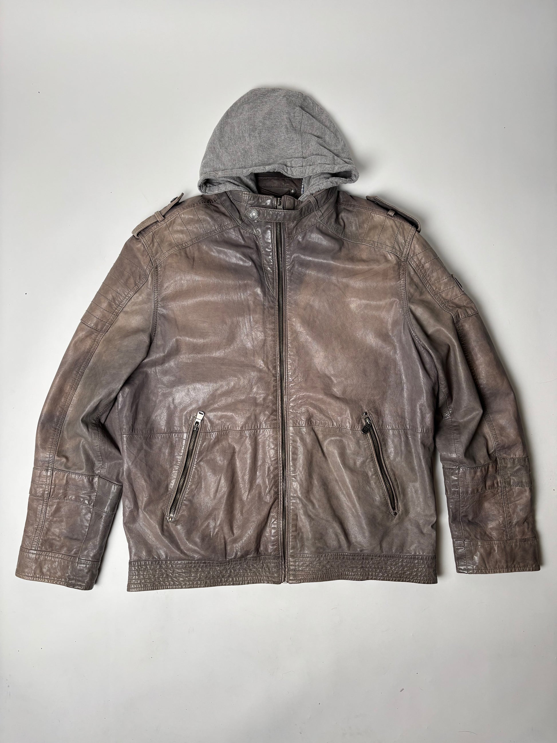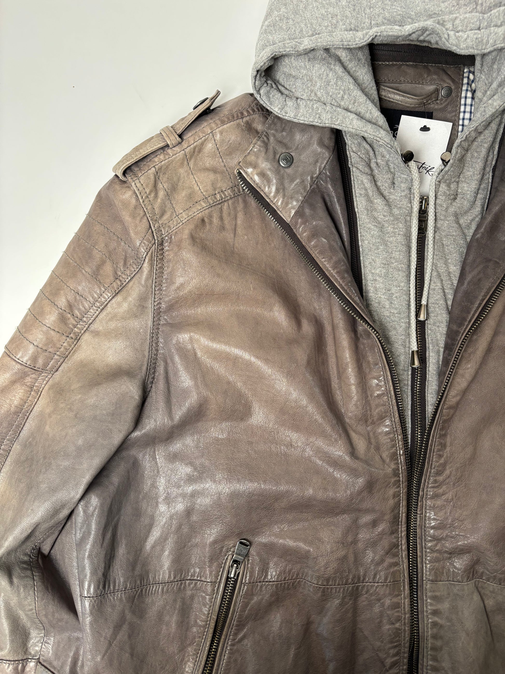 Leðurjakki með "Hettupeysu" hettu - hægt að taka af.